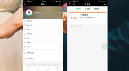 微信小程序设计时,每个页面都应有明确的重点,以便于用户每进入一个新页面的时候都能快速地理解页面内容。我的界面提供会员卡、电子优惠券、积分等趣味工具辅助营销,增强与消费者的互动。